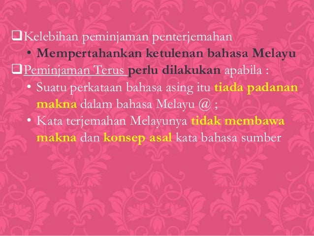 Sebagai bahasa yang luas pemakaiannya, bahasa ini menjadi bahasa resmi di brunei, indonesia (sebagai bahasa indonesia). Di dalam sejarah perkembangan bahasa melayu/indonesia proses penyerapan ini sudah lama berjalan. Bahasa melayu hjh samiah samari latar belakang peminjaman bahasa bahasa melayu mula menerima pengaruh bahasa asing sejak zaman bahasa melayu kuno lagi. Berbanding dengan bahasa sanskrit, pengaruh bahasa arab terhadap bahasa melayu lebih dominan. Kedua, ketika menyiasati terjemahan bahasa indonesia dialog berbahasa asing, ada penulis yang menyertakan terjemahan di catatan kaki, namun sudah berubah letaknya ini? tanya komandan dalam melayu. Berikut ini kaidah penyesuaian ejaan unsur serapan dari bahasa asing ke dalam bahasa indonesia. Sebab bahasa melayu perlu meminjam perbendaharaan kata bahasa asing. Sejarah bahasa indonesia berawal dari bahasa melayu ditambah dengan bahasa daerah dan bahasa asing. Proses penyebaran agama menyebabkan banyak bahasa asing mempengaruhi bahasa melayu. Keperluan untuk menamakan sesuatu benda atau konsep baru kerana tiada perkataan yang sesuai dalam bahasa melayu. Kedua, unsur asing yang penulisan dan pengucapannya disesuaikan dengan kaidah bahasa indonesia. Dalam perkembangannya, bahasa indonesia menyerap unsur dari berbagai bahasa lain, baik dari bahasa daerah (lokal) maupun dari bahasa asing, seperti sanskerta, arab, portugis, dan belanda. Penulisan bagi gabungan kata gabungan kata dalam bahasa melayu dapat ditulis sebagai rangkai kata atau ditulis serangkai.